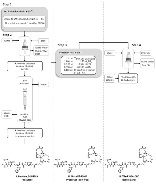 The multistage production of [89Zr]Zr-PSMA-DFO is relatively complex (Figure 1). One particularly time-consuming aspect of the labeling process is the removal of iron from the precursor Fe-N-sucDFO-PSMA. In addition to the time factor here, there is also the question of how well this multistage process adheres to Good Manufacturing Practice (GMP) guidelines. Ideally, the actual coupling of Zr-89 to the PSMA ligand should take place using a synthesis module.