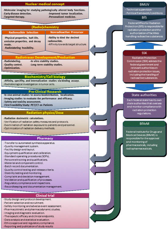Overview of the multidisciplinary stages and government institutions involved in the development of a radiopharmaceutical in Germany.