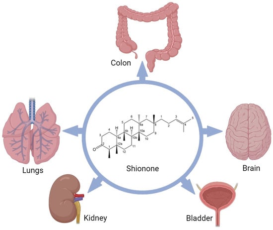 Protective role of shionone in multiple organs in in vivo studies. “Created with BioRender.com accessed on 18 December 2023”.