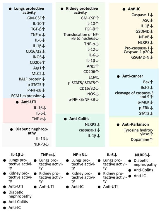 Markers/targets associated with the pharmacological activities of shionone. Genes identified in in vivo studies and found to be associated in more than two studies are listed with a white background. Abbreviation: Anti-IC: interstitial cystitis; Anti-UTI: urinary tract infection; Arg1 arginase 1; ASC apoptosis-associated speck-like protein containing a CARD; BALF: bronchoalveolar lavage fluid; Bax: BCL2-associated X; Bcl-2 B-cell lymphoma 2; CD: cluster of differentiation; ECM1: extracellular matrix protein 1; GM-CSF granulocyte–macrophage colony-stimulating factor; GSDMD: gasdermin D; IL: interleukin; iNOS: inducible nitric oxide synthase; MLC2: myosin regulatory light chain 2; NF-κB: nuclear factor-κB; NLRP3: NOD-, LRR-, and pyrin domain-containing protein; p-ERK: phosphorylated extracellular signal-regulated kinase; p-STAT5: phosphorylated signal transducer and activator of transcription; TGF-β: transforming growth factor β; TNF-α: tumor necrosis factor α; ↑: up-regulation; ↓: down-regulation.