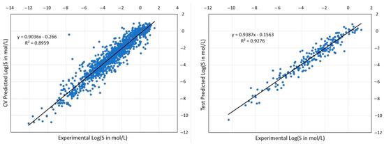 When the hyperparametrized model having the minimum RMSECV was achieved with a 20-fold CV, the 20-fold CV sample split was saved and used for the conformal prediction calculation. In addition, the root-mean-square error of the validation on the test set (RMSEV) was calculated, together with R2 values for the cross-validated training set (CV-set) and the test validation set (V-set) using experimental Log(S). Accuracy measures already considered besides RMSE and R2 were %Log(S) ± 0.7 and %Log(S) ± 1.0, where %Log(S) ± 0.7 represents the maximum accuracy of the model based on the available data [12].