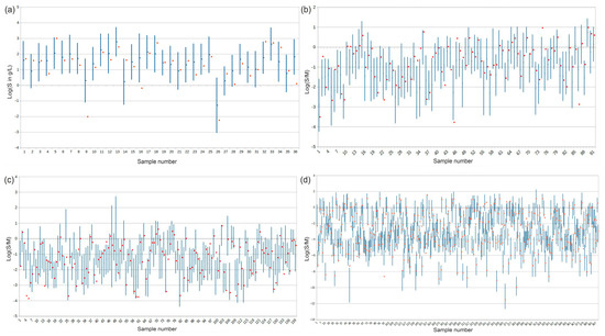 Solubility prediction intervals for test samples at the 90% confidence level for the (a) Methanol data set, (b) Acetone data set, (c) Ethanol data set, and (d) Water-wide data set. Blue line—prediction interval, red point—experimental Log(S). Details in Supp. Data Sets Tables.
