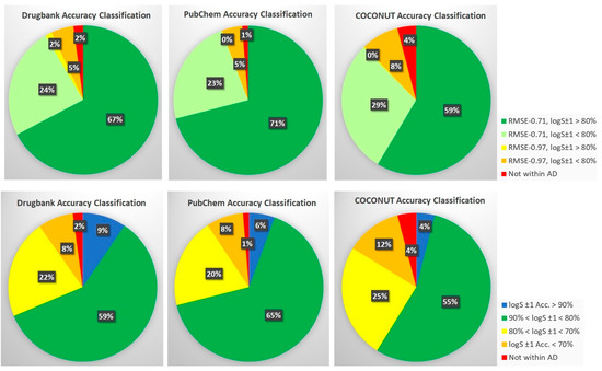 FSTI-XGB extrapolation results from AqSolDB-w (EM-N) and AqSolDB-n (ARSS) models to three databases are presented in Figure 4. The first three upper pies display the yields of these two models concerning the fraction of compounds that fall in and out of the LogS ± 1 > 80% accuracy statistic. Thus, altogether, there are 2 × 2 accuracy classes obtained. The lower three pies are merged results of two models while taking into account more confidence levels (not just 80%). Therefore, four accuracy groups are also obtained, satisfying these conditions: (1) logS ± 1 > 90% accuracy level, (2) 90% > logS ± 1 > 80%, (3) 80% > logS ± 1 > 70%, (4) logS ± 1 < 70%.