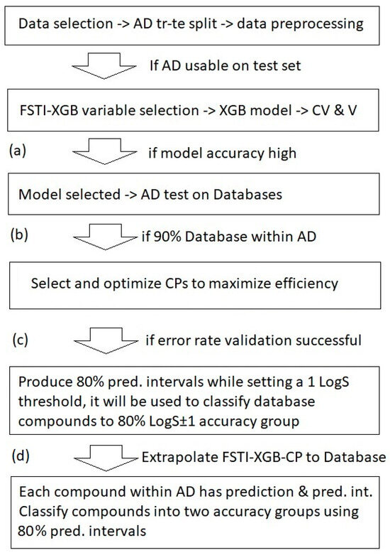 Scheme 1 displays our research strategy of informative solubility estimation of external databases. Concretely, after AD rules approve the train–test split, the first task (a) of the mandatory objectives is testing and proving model accuracy. The second task (b) is to test whether the AD of the training set covers the most compounds of external databases; usually if the data set contains too few compounds or if the training set is composed of a large number of too similar compounds, the second step already results into a weak AD cover of database compounds. The third point (c) is to obtain narrow prediction intervals using the “optimal” combination of CP and sensitivity coefficient, β, and then successfully validate these intervals using the error rate described in Section 3. If that validation is successful, only then can the informative extrapolation to the external database be carried out. It produces both predictions and prediction intervals for each compound of the database. The very last step (d) is the successfulness of the whole extrapolation, which is described in the subsequent subsection because it also depends on the database where built models are extrapolated. Other ML solubility references carry out the first task (a) and provide a detailed descriptor analysis and method discussion. But in most cases, they stop there or are oriented toward the AD assessment of relatively small test sets at best [36].