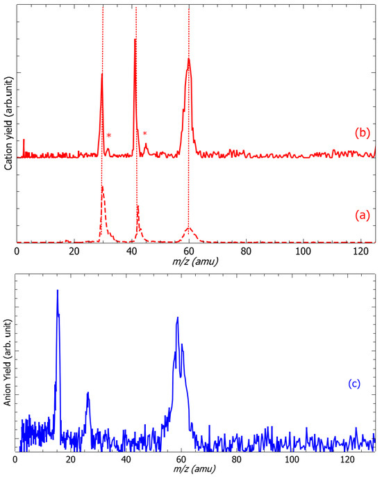 Cation (red) and anion (blue) mass spectra. (a) The cation mass spectrum (red dashed line) recorded at the electron energy of 16 eV from EG2 presents fragments agreeing with the NIST databank report [21], (b) (solid red line) recorded at the electron accelerating voltage from EG2 of 9.0 eV, EG1 set to 3.2 V exhibits additional features (red stars), and (c) the anion mass spectrum recorded at the electron accelerating voltage of EG1 of 3.2 V, EG2 set to “off” shows four peaks at m/z 16, 26, 59, and 69, respectively. The dotted lines are a visual guide.
