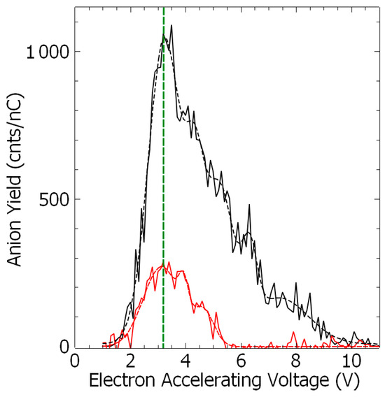 Yield of the anion fragment (NH−, black, and CN−, red) as the function of the incident electron accelerating voltage. The dashed lines are a visual guide. The green dashed line corresponds to the peak position of 3.1 eV (see Table 2).