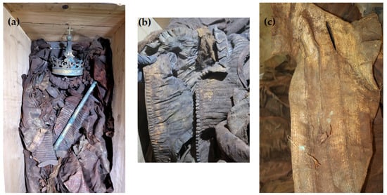 The textiles remained in relatively good condition after over 300 years in the environment of the crypts. Their structural integrity remains intact, and defects such as holes, tears, and other damage are relatively rare. The robes worn by the royal couple were soiled with surfaces covered with dust and organic impurities. Most samples were contaminated with inorganic particles. Micrographs of the historical textiles also show biological colonization (Figure 5b).