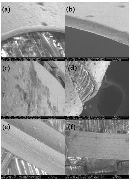 Metal threads—characteristics of manufacturing methods: (a,b) rounded edges of the thread made of flatten wire, (c,d) sharp edges of threads cut form the metal sheet, (e,f) traces of drawing the wire.