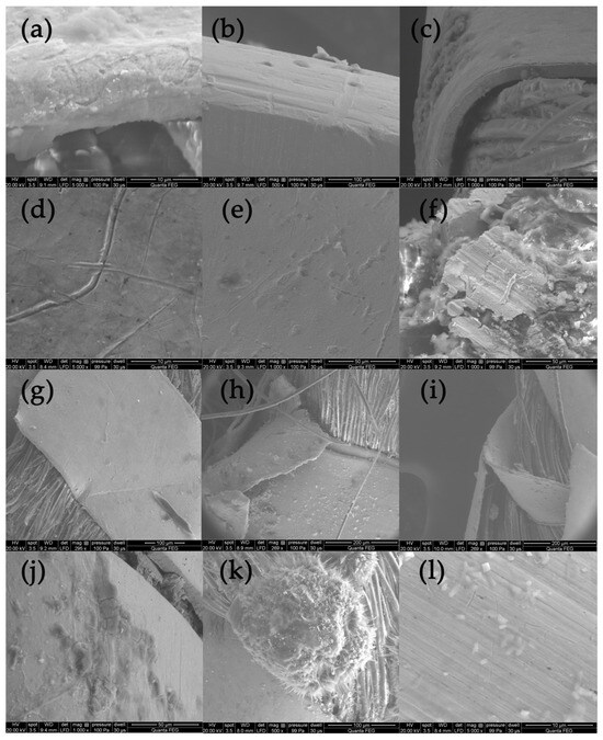SEM images presenting destruction of metal threads: (a–c) loss of gold layer; (d) scratches, (e,f) corrosion, (g–i) defragmentation, (j–l) crystalline structures.