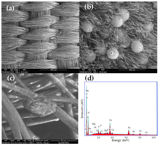 SEM micrographs of (a) textile Sig2 (mag. 100×), (b) textile Sig9 (mag. 100×), (c) textile Sig5 (mag. 1000×), (d) SEM-EDS spectrum of textile Sig2.