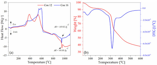 Thermograms of samples: (a) Con12 and Con16, DSC; (b) Sig11, TGA-DTG.