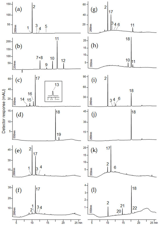 Chromatograms of extracts taken from samples: (a) cochineal, (b) madder, (c) gallnuts, (d) indigo, (e) Sig2, (f) Sig3, (g) Sig11, (h) Con15, (i) Con17, (j) Con20, (k) Con22, (l) Con14. For chromatographic conditions, see experimental section.