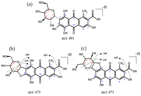 In the extract of textile sample Sig11, a compound with a molecular anion at m/z 473 was also detected. This molecular anion differs by 18 atomic mass units from the ion of carminic acid. Therefore, it may have originated from carminic acid through the elimination of water, involving the hydroxyl substituent at position C-2′ of the sugar moiety and the hydroxyl groups at either the C-6 or C-8 position of the aglycone [6,62]. This transformation is facilitated by the hydrogen bond between the ether oxygen atom of the sugar ring and the 6- or 8-hydroxyl group (Figure 8).
