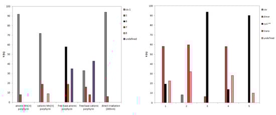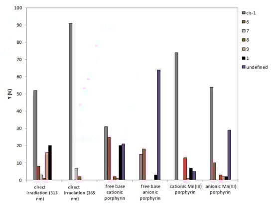 Yields (%) of photoproducts obtained from the starting compound 1 under direct irradiation or using Mn(III) and free base cationic/anionic porphyrins for reactions performed in a batch reactor (followed by HPLC).