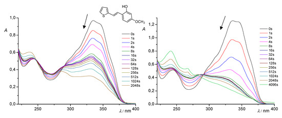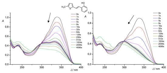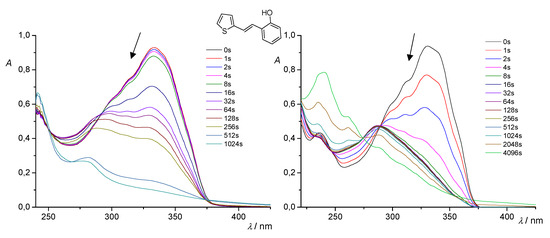 As for the spectral series recorded during the direct irradiations of the various starting compounds 1–5 in time at 313 and 365 nm (Figure 5, Figure 6, Figure 7, Figure 8 and Figure 9), they are rather similar. In all cases, the absorption spectrum of the starting trans-isomers gradually decreased and transformed to another species, which was the corresponding cis-isomers. At prolonged irradiations, the absorbance increased at shorter wavelengths, indicating that the products contain less unsaturated bonds. More specifically, in the case of compound 1, isomerization at 313 nm is somewhat slower than at 365 nm (Figure 5). Of course, it should be kept in mind that these observations are at much lower concentrations of solutions in ACN than the preparative experiments. In the case of compound 2, there are very similar tendencies of changes at both wavelengths (Figure 6), while in the case of 3, the situation is similar to that of compound 1, although, in the preparative experiment, there are significant differences apparently due to concentration (Figure 7). Illumination of compound 4 at 365 nm results in a faster change to the cis-isomer than at 313 nm and a faster shift of the maximum wavelength toward lower values (Figure 8). In the case of derivative 5, the increase in absorbance at lower wavelengths, especially for experiments at 365 nm, clearly indicates the formation of the electrocyclization photoproduct (Figure 9).
