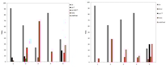 Yields (%) of photoproducts obtained and the remained trans-isomer of compounds 1–5 for reactions performed in (left panel, * product of photochemical electrocyclization reaction and ** cyclization products with 2OH functional groups, see Table 3) a batch reactor (t = 30 min) and (right panel, ** product of photochemical electrocyclization reaction, see Table 8) flow reactor (τ = 2′) using LED lamp of 365 nm (without photocatalyst).