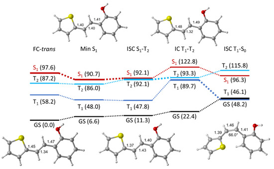 As seen before, direct photoreactivity of 1 seems to involve both photocyclization (formation of 7) and photoisomerization (formation of cis-1, see Scheme 1) among other, more complex products. Thus, we initially focused on the reactive pathways leading to these products. The simplest approach was to consider a straightforward C=C photoisomerization process. However, unfruitful efforts were made to find any conical intersection (CI) point along the typical torsion and inversion mechanisms using CASSCF. As an alternative, we envisioned the possibility of the involvement of intermediates of different multiplicity, potentially caused by the thiophene moiety. For that, we considered the contribution of triplet states promoted by the sulfur-containing ring to participate in the isomerization process for the initial compound 1 to yield cis-1. This required the use of TD-DFT under the ωB97XD/6-31G* methodology (Figure 13). Thus, after recomputing the critical points along the potential energy surface, we found that the excitation of the thermodynamically stable trans-1 yields on S1 evolving via an initial stretching to a high energy minimum with a minimal geometry distortion (Min S1). From here, an intersystem crossing point is readily accessible (ISC S1-T2, ca. 1 kcal/mol above), allowing the population of T2. This, in turn, easily converts to T1, which evolves, rotating to two isoenergetic ISC points with the ground state. Both ISCs feature a torsion of 66° (ISC T1-S0, Figure 13) and 122°, respectively, being slightly lower in energy than the one at 66°.