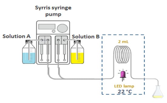 The following solutions were prepared for the experimental procedure in a flow reactor (Figure 15). Solution A: compounds 1–5 were dissolved in air-saturated technical acetone in a volumetric flask of 20 mL so that the concentration of the solution was 0.001 M. Solutions were placed under air-filled balloon; solution B: catalysts MnC, MnA, FbC or FbA were dissolved in oxygen saturated H2O in a volumetric flask of 20 mL so that the concentration of the solution was 0.0001 M. Solutions were placed under oxygen filled balloon. Two residence times were examined: (a) τ = 2 min; (b) τ = 10 min, as well as four LED lamps: (c) 365 nm; (d) 405 nm; (e) 420 nm; (f) 450 nm.