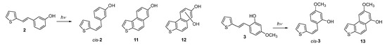 As reactions were cleaner without photocatalysts in the case of 1, for resveratrol analogs 2–5, only direct irradiations at 313 and 365 nm were conducted in a batch reactor (Scheme 2 and Scheme 3, Table 3). As can be seen, compounds 2–5 gave mainly the corresponding cis-isomer and its electrocyclization product under the applied conditions. Only in the case of compound 2 (the only one with a meta-positioned OH group) was the formation of the hydroxylated derivative 12 detected (obtained from the photoproduct 11).