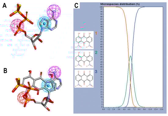 Pharmacophore features and species of 1,8-dihydroxy-4,5-dinitroanthraquinone (DHDNA) in the full pH range. (A) Features used to create the query pharmacophore model: hydrogen bond donor, aromatic system, and hydrogen bond acceptor are represented in magenta, blue and red spheres, respectively. (B) Overlap of AGS with DHDNA also represented in the same colors. These representations were generated with Discovery Studio using the coordinates obtained from Pharmit analyses. (C) Distribution of the three species of the DHDNA across the entire pH range, (1) protonated, (2) semi-protonated, and (3) deprotonated species.