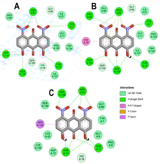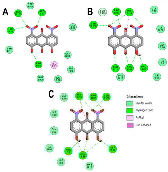To better understand the DHDNA interactions at the active site of the three PPATs, the interaction diagrams of the molecular docking results were analyzed. The results of the three species of DHDNA complexed with SaPPAT (Figure 4A–C) show that their substituent groups (-OH, -O−, and -NO2) participated in interactions at the NBS, but dDHDNA established a lower number of hydrogen bonds. Notably, all the DHDNA states interact with critical residues, such as HYS19, which stabilizes ATP to nucleophilic attack at the α-phosphate group; ARG92, which is involved in the stabilization of the β-phosphate of the nucleotide; and the conserved SER130, which is part of a three-serine stretch located at the floor of subsite S1 [13].