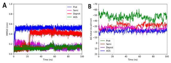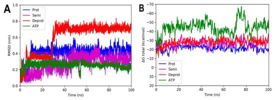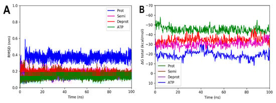 On the other hand, the analyses of the complexes with EfPPAT reveal RMSD values with greater fluctuations during most of the runs, Figure 8A. Among them, the complex with the semi-protonated form exhibited relatively better stability, showing an RMSD below 0.38 nm during most of the analysis time. However, despite fluctuations, even the less stable complex formed with the deprotonated state also did not leave the enzyme throughout the run, apparently, as suggested in its total binding energy plot (negative values), Figure 8B. It is noteworthy that, in the complexes with both enzymes of Gram-positive bacteria, there are no marked differences between the total binding energies, results that agree with the docking analyses.