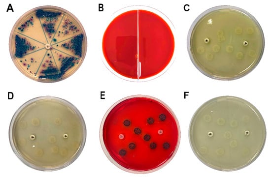 Samples streaked in chromogenic agar to isolate antibiotic-resistant S. aureus, E. faecalis, and E. coli and the effects of DHDNA on bacterial growth. (A) Chromogenic agar plate with ciprofloxacin disc (5 µg) to identify and isolate antibiotic-resistant bacteria. (B) S. aureus (left) and E. faecalis (right) exposed to 125 µg/mL of DHDNA. (C) S. aureus on agar plates with 1% DMSO in the proximity of ciprofloxacin discs to confirm antibiotic resistance. (D) E. faecalis in the same anterior conditions. (E) Colonies of E. coli exposed to 125 µg/mL of DHDNA and (F) on agar plates with 1% DMSO. DHDNA causes the red color of the agar plate. The images are representative of at least three independent experiments.