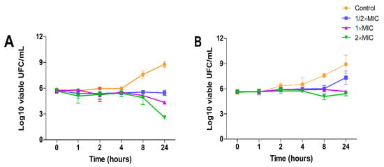 The effects of DHDNA on the growth kinetics of both the S. aureus and E. faecalis reference strains were studied to determine whether its effect is bacteriostatic or bactericidal. Figure 11A shows that, from eight to 24 h of exposure at concentrations of 31.125 µg/mL (1 × MIC) and 62.5 µg/mL (2 × MIC), DHDNA induced a concentration-dependent reduction trend in the number of S. aureus relative to control. However, this reduction was ≤3 log10 cfu/mL relative to the number of bacteria in the initial inoculum. In E. faecalis, after 24 h of exposure, even to a concentration of 125 µg/mL of DHDNA (2 × MIC), the number of bacteria remains essentially unchanged compared to the initial count, Figure 11B.