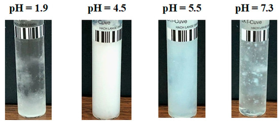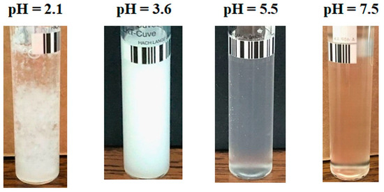 For low Lys concentrations, the formed complexes are soluble in water, and a clear system is observed (Figure 3; pH = 5.5 and pH = 7.5). The increase in Lys concentration increases the hydrophobicity of the complexes formed at a basic pH. Thereby, for the sample with wPAA = 0.7, cp = 3%, and cLys = 0.6%, a precipitate was observed at pH = 7.3 (Figure 4).