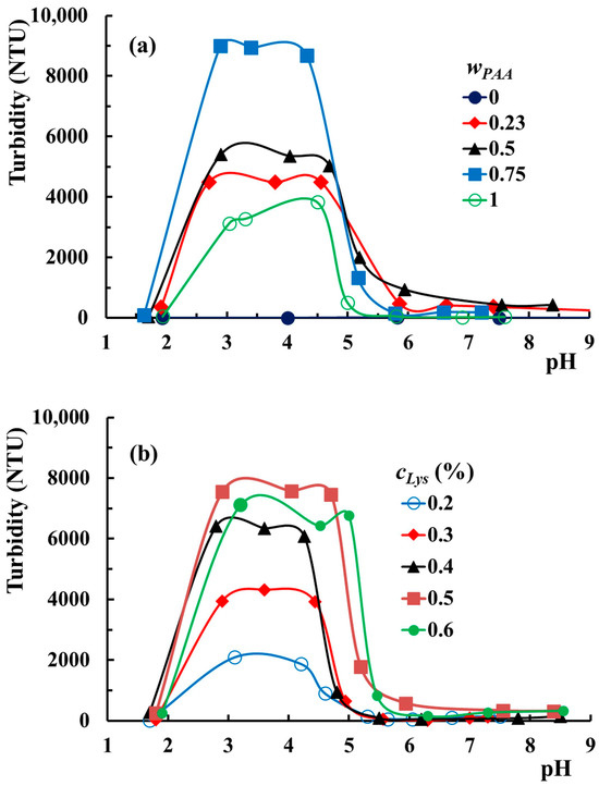 In order to understand the interactions established as a function of pH and the role of each component in the observed phenomena, the effect of wPAA and cLys on the pH intervals corresponding to each phase observed above was studied. The effect of the PAA amount on the turbidimetric curves is illustrated in Figure 5a.