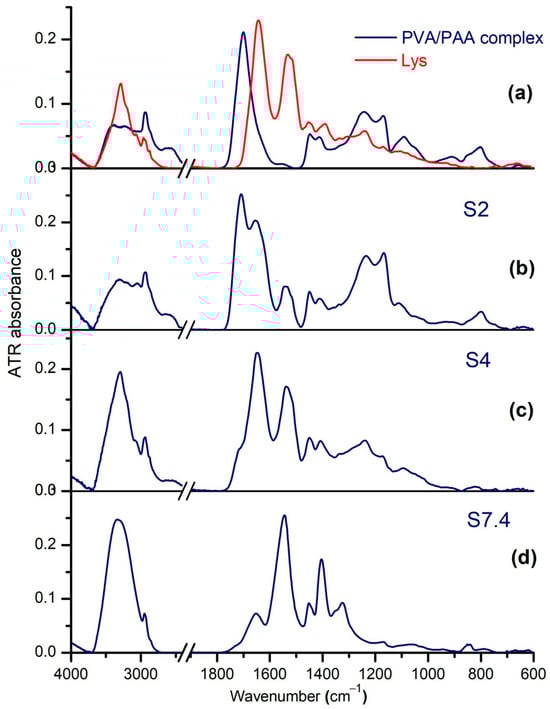 The ATR-FTIR spectra of (a) PVA–PAA complex and Lys, and of PAA–PVA–Lys complex at (b) pH = 2 (S2), (c) pH = 4 (S4), and (d) pH = 7.4 (S7.4).