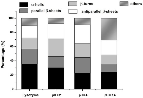The histogram of the secondary structure fraction presented in Figure 7 shows that the formation of Lys–PAA–PVA complexes did not significantly affect the content of regular α-helices, excepting that at pH = 7.4.