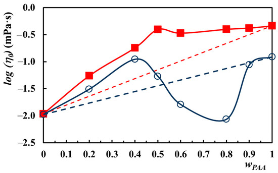 Logarithm of zero shear viscosity as a function of wPAA for PAA–PVA mixture (cp = 2.5%) in 0.2% Lys aqueous solution at pH = 4 (empty symbols) and pH = 7.4 (filled symbols); the dotted lines represent the additive rule calculated with Equation (2).