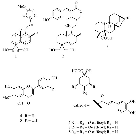 NMR and ESI-MS spectral data analysis followed the comparison with those reported in the literature, allowing for the identification of gaudichaudol C (2) [25], ent-kaurenoic acid (3) [26], hispidulin (4) [26], eupafolin (5) [27,28] and one mixture of di-O-caffeoylquinic acids (6–8) [29,30]. Compounds 3–8 were previously isolated from B. sphenophylla [23,24,31], with this research being the first report of compound 2 in the studied plant.