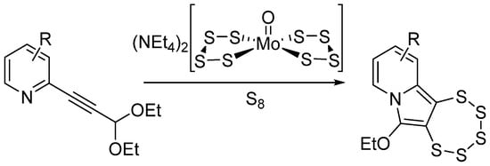 Despite this somehow limited pentathiepine stability, harsh conditions and/or harmful reagents were generally common features in the synthesis of artificial PTEs [20] until the serendipitous discovery of a molybdenum-mediated preparation by Zubair et al. in 2013 (Figure 1) [21]. The reactions are carried out by the application of a much milder protocol, which uses azines bearing an alkyne that carries a diethoxyacetal-protected aldehyde adjacent to the nitrogen. The result is a 1,2,3,4,5-pentathiepino[6,7-a]indolizine derived structure, which can easily be varied on the backbone and which is, most notably, substantially more stable than other analogues. These are characteristics which should have the potential to pave the way towards future pharmacological applications.