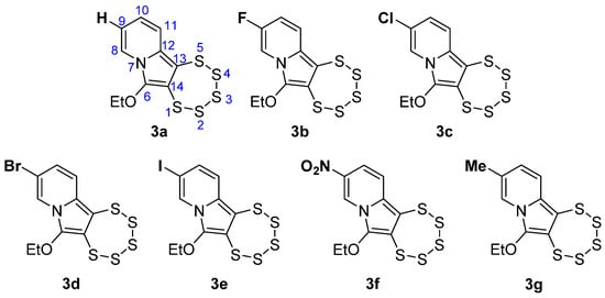 Chemical structures of the novel 1,2,3,4,5-pentathiepino[6,7-a]indolizines 3a–g, with the numbering scheme shown for 3a as an example.