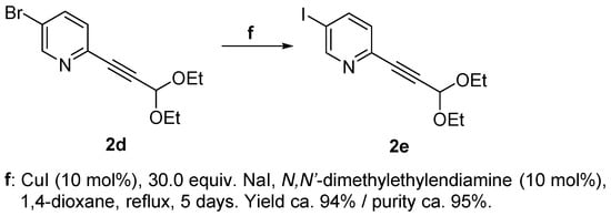 5-iodo-2-alkynylpyridine (2e) was derived from 5-bromo-2-alkynylpyridine (2d) via a metal-assisted variation of the Finkelstein reaction. A halogen substituent in ortho position to the aza group (such as Br in 4–6, Figure 4) is substantially reactive. Yet, iodine substituents are typically more labile than their lighter congeners. Considering both of these factors, an attempt was still made to obtain 3-iodo-6-bromopyridine via the Sandmeyer reaction route (as was successful for the fluorine derivatives) followed by Sonogashira coupling. This endeavor, however, was unsuccessful, as the subsequent Sonogashira coupling occurred exclusively at the C–I bond as shown by MS analysis, with signals exhibiting the characteristic bromine pattern.