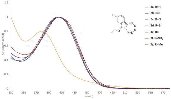 Superimposition of the normalized UV-vis spectra of the seven compounds (10−4 M in THF) of this study, highlighting the substantially distinct behavior of the nitro derivative 3f and thereby the influence of this specific substituent on the relative energies of the frontier orbitals.