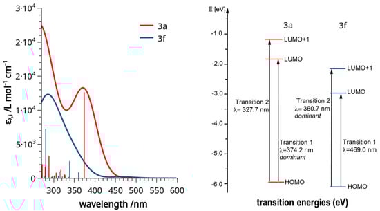 To better understand the measured experimental UV-vis data, density functional theory (DFT) calculations were performed, starting with the coordinates obtained from XRD measurements [32,33,34]. Considering the very similar UV-vis spectra of all the analyzed molecules (except for the nitro derivative 3f), only compound 3a was chosen for the comparison with 3f. Compound 3a has also the advantage of being the simplest one amongst the derivatives. A considerable deviation of the calculated spectra from the measured ones with regard to the absorption energies, due to the density functional calculation force field and base set of choice [35,36,37], was noted. However, since only a qualitative evaluation was targeted, this was not considered significant as the deviation is equally present for both computed molecules, and the same ‘shift’ is still observed between the maxima of absorptions. The difference between the HOMO and LUMO energies of 3a and 3f are −3.757 eV and −3.195 eV, respectively (Figure 8). The calculations show that the transitions, which are based on the electron density of the aromatic system, experience a redshift for the nitro derivative, which deprives the resonating moiety of electron density. Notably, the extinction of the HOMO–LUMO-transition, which is dominating in the spectra of 3a–e and 3g, is in 3f very much diminished and, in fact, as the experiment shows, not practically observable. This means that we do not see a shift of an analogous band of 3f relative to all the others, but rather the disappearance of the analogous band and concomitant emergence of another, distinct signal. This is the HOMO–LUMO+1 transition with a relatively strong extinction. The transitions to orbitals higher than the LUMO in the nitro derivative similarly experience a redshift relative to the other derivatives. The HOMO–LUMO+1 excitation of 3f thereby just falls into the measurable wavelength range and can be observed at 360 nm. Because its extinction coefficient is quite high, this band is dominating the spectrum, and it is responsible for the distinct red color of 3f.