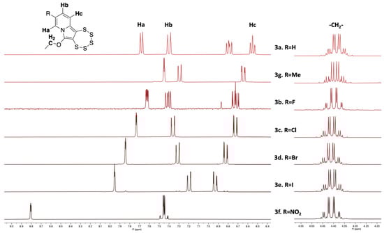 1H-NMR (300 MHz, CD2Cl2) spectra of the seven PTEs of this study with a zoom on aromatics and methylene (–CH2–) signals. The unaffected shape of the qd signal on the right stands out compared to the chemical shift and shape modification of the patterns on the left. N.B., the additional aromatic signal for 3a goes back to the H in position 9, and in the spectrum of 3b, some fluorine coupling is observed.