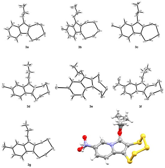 All seven 1,2,3,4,5-pentathiepino[6,7-a]indolizines of this study could be crystallized sufficiently well in order to carry out single crystal X-ray diffraction structural analyses (Figure 11). Despite the variance in functional groups, all structures exhibit a nearly flawless superimposition with each other except for the varied substituent and the more flexible ethoxy group, as demonstrated by an overlay of 3f and 3g. These two were chosen as the most distinct in their electronic structures according to the NMR results. Notably, in all seven cases, both the ethoxy substituent and the five sulfur atom chains extend from the aromatic plane towards the same side of this plane. A search of the CSD [45] for a pentathiepine moiety fused to a five-membered ring with an adjacent ethoxy substituent gave five hits, all from our group [21,23,24]. The number of available ethoxy-substituted indolizine-derived pentathiepine molecular structures is, hence, with the present study, more than doubled. While the configuration of the pentathiepine itself is conserved throughout all examples, the ethoxy groups in the databank structures do extend towards one side of the aromatic system or the other relative to the sulfur atoms. Still, the very much conserved spatial arrangement of these pentathiepines would allow, for instance, for the building of computational models of related PTEs based on the available crystal data, and that may very well facilitate a screening of potential PTE-derived drugs in molecular docking studies even before they are actually made. In this context, the similarity of the seven structures of this study may prove to be quite valuable to the chemical and pharmaceutical communities interested in polysulfur compounds.