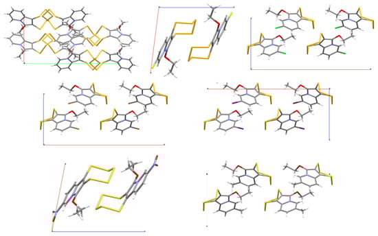 The space groups of the fluorine- and nitro- substituted PTEs are the same (P, Z = 2), and their packing with the two pentathiepine moieties of the molecules in the unit cell facing each other is similar (Figure 12). A minor difference is the fact that the aromatic moieties of one layer are exactly coplanar in the case of 3f, because the nitro groups are engaged in in-plane hydrogen bonds, whereas those of 3b are slightly spaced. In the cases of 3c–3e and 3g (Cl, Br, I, and CH3 substitutions), the space group is Pca21, with four molecules in the unit cell. The packing patterns look surprisingly similar given the difference in the size/bulk of the substituents employed. The non-substituted 3a is the only compound which crystallizes in the space group Pbca, with eight molecules in the unit cell, and it has a different packing pattern compared to any of the other six compounds.