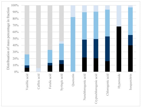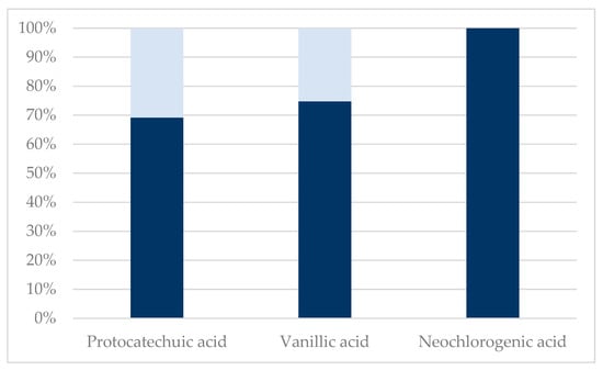 It is, however, worth mentioning that flavonoid glycosides, i.e., isoquercitrin and hyperoside, were neither present in the permeate nor retentate obtained from membrane filtration of the acid-hydrolyzed extract. This clearly indicates a deglycosylation and further degradation of the aglycones, as quercetin was also not present in the obtained permeate and retentate fractions. Furthermore, an increase in concentration of hydroxybenzoic acids, protocatechuic acid, and vanillic acid (see