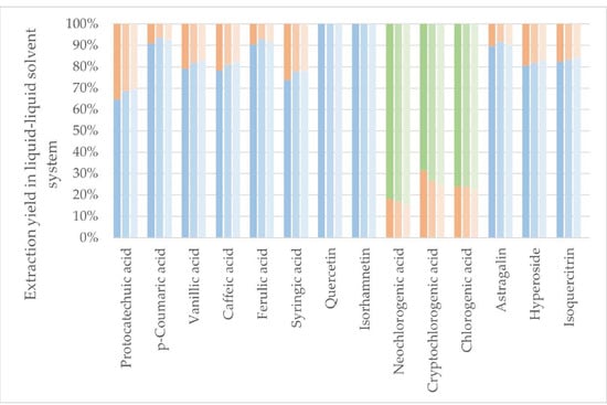 Figure 3), and the distribution of the polyphenols was calculated in the sequential liquid–liquid extractions. Similar extraction results were obtained regardless, though a tendency was found that protonated compounds at lower pH would be isolated better in the lower polarity solvent, EtOAc, especially the phenolcarboxylic acids.
