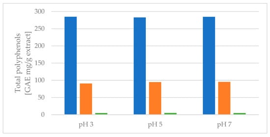 8]. To investigate polyphenols’ protonation, batches of water were acidified to pH 7, 5, and 3, and the freeze-dried extract was added to yield a DM loading of 3.3