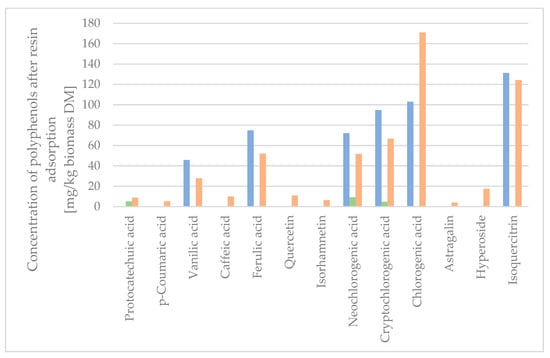 Figure 5. The quantifiable amount of the compounds of the XAD-4 adsorptions was higher than the quantifiable amount of compounds from the raw extract, as the concentration of the compounds of interest was higher in the fractions obtained by resin adsorption. The sum of the compounds isolated, when calculated in mg/kg biomass DM, was 106.5 w% for the XAD-4 resin desorbate with 3.6 w% lost in the water washing the column post-adsorption. The concentration of the extract on the XAD-4 resin resulted in a minimal loss of active compounds in the washing waters, which were found to be mainly chlorogenic acids due to the lower affinity towards XAD-4 resin. Seven polyphenols were completely adsorbed on the XAD-4 resin (p-coumaric acid, quercetin, isorhamnetin, chlorogenic acid, astragalin, hyperoside, and isoquercitrin), despite some of the analytes containing polar and semi-polar functional groups (glucose, galactose, carboxyl group, and quinic acid).