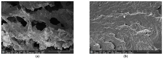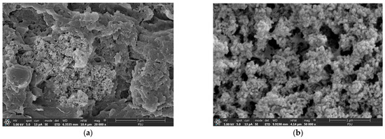 Field emission scanning electron micrographs of CSH column before phosphate adsorption with (a) 200× and (b) 20,000× magnifications.