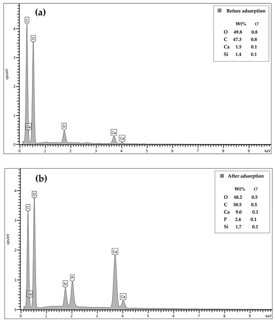 Energy-dispersive X-ray spectra of CSH column before (a) and after (b) phosphate adsorption.
