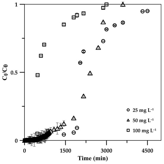 The influence of the initial phosphate concentration on the CSH column performance for phosphate adsorption was investigated by varying the influent concentration from 25 to 100 mg L−1 while maintaining a constant flow rate and column height of 5 mL min−1 and 5 cm. From the BTCs (Figure 5), it can be observed that increasing the initial concentration provided a sharp BTC, indicating a relatively small mass transfer zone at the column front when high phosphate concentration was adsorbed, potentially due to the high concentration gradient of phosphate ions on the column and in the bulk fluid and a high diffusion coefficient and mass transfer driving force at a high phosphate concentration [24,44,45]; this resulted in a great phosphate saturation rate at fixed active sites on the CSH column [46], leading to a reduction in breakthrough times (Tb: the time at Ct = 0.1C0) from 1920 and 480 min at 25 mg L−1 and 100 mg L−1 (Table 2), whereas the exhaust time (Ct = 0.9C0) decreased from 3600 to 1920 min. The maximum capacity of phosphate (qe) on the CSH column increased from 115.2 to 308.5 mg g−1 with an increasing initial phosphate concentration from 25 to 100 mg L−1 due to the high mass transfer driving force [24,44,45], where the adsorption efficiency remained >99% in these concentration ranges.