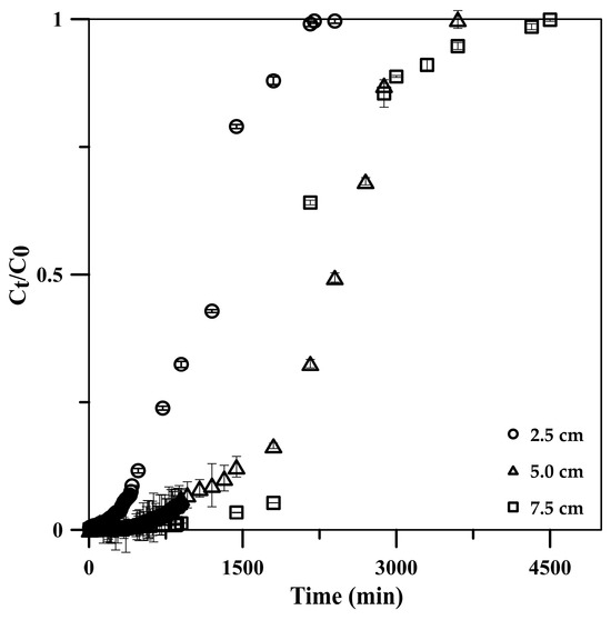 The influence of column height was investigated using the constructed BTCs at column heights of 2.5, 5.0, and 7.5 cm under a constant influent flow rate and phosphate concentration of 5 mL min−1 and 50 mg L−1, respectively. The results showed a decline in the BTC slopes (Figure 7), attributed to the long contact times between phosphate and the CSH column with a long column height [47]. The breakthrough time increased from 720 to 2160 min with the column height increasing from 2.5 to 7.5 cm (Table 2). The longer breakthrough time indicated better intraparticulate diffusion in the column, resulting in the higher adsorption capacity of the column (qtotal increased from 599.9 to 1199.7 mg) [45,48]. Moreover, the increase in the column height increased the CSH column surface area, leading to an increase in the availability of phosphate-binding sites [24]. Additionally, the axial dispersion was decreased in the mass transfer, resulting in an increase in phosphate diffusion into the adsorbent [45,48]. Thus, phosphate had enough time to diffuse into the cryogel composite and stay longer in the column, resulting in an increased treated volume from 12,000 to 24,000 mL while maintaining a high adsorption efficiency of >99.9% at the column height range.